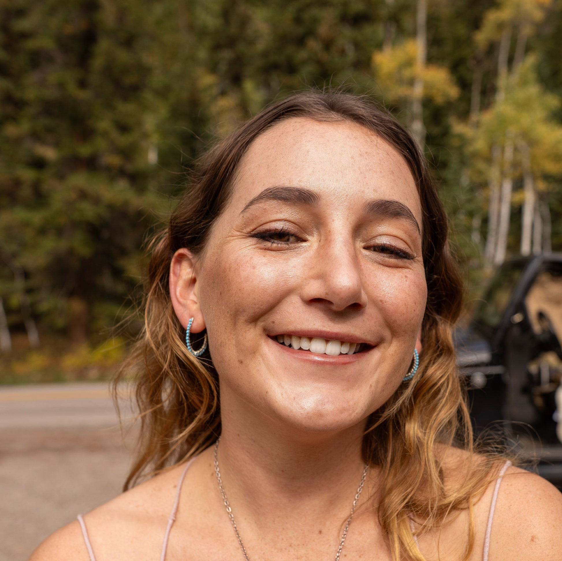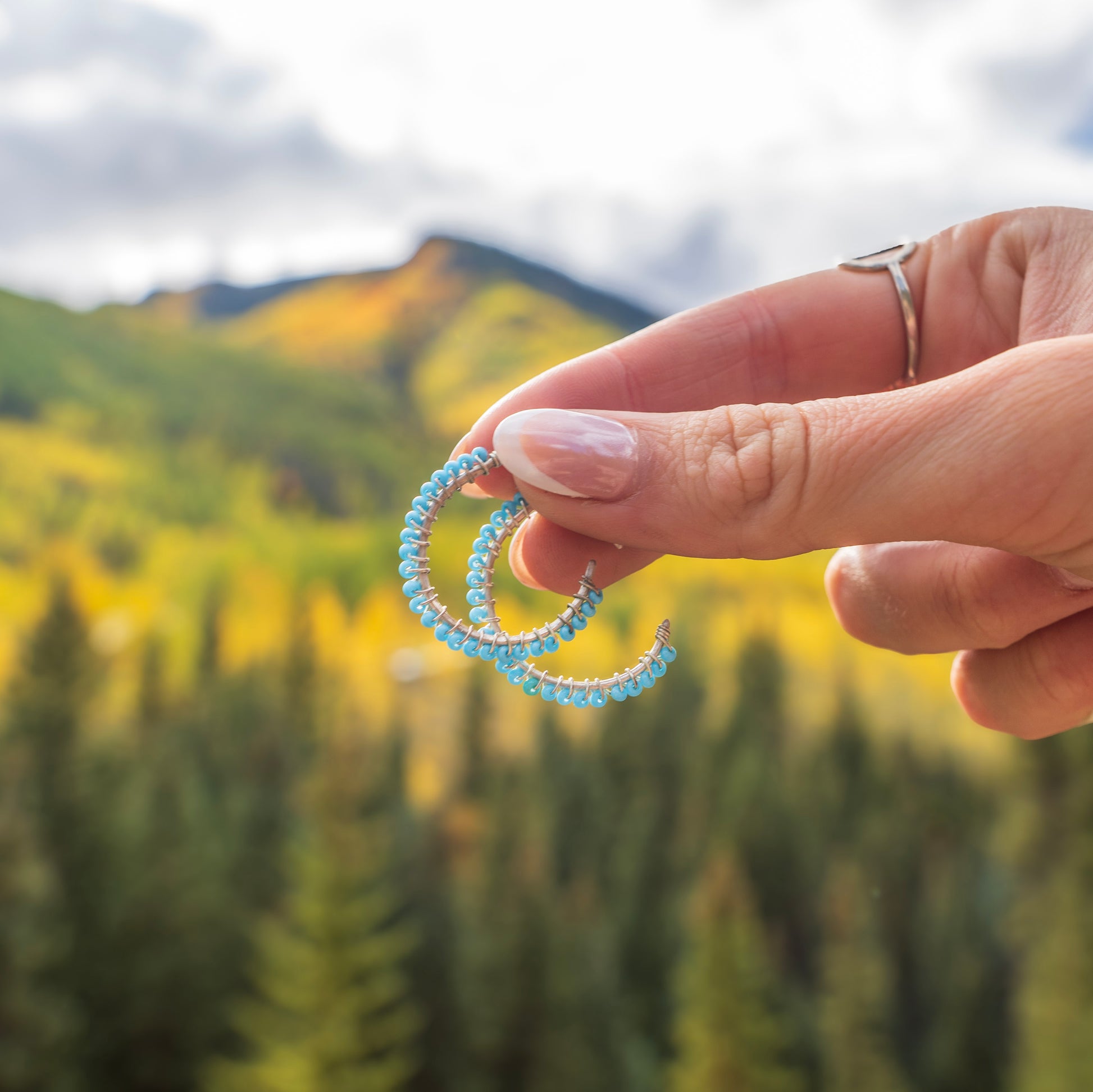 Turquoise beads hand wrapped on a hammered silver frame. Light enough for everyday but still a statement!